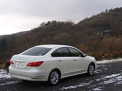 新型シルフィはティーダと同じプラットフォームを使った5ナンバーセダン。リアからの眺めはトランクリッドの位置がやや高いのが気になりますが、まあ無難にまとまっています。ラティオよりずっとすっきりしていて、私はシルフィのほうが好きだなぁ。
