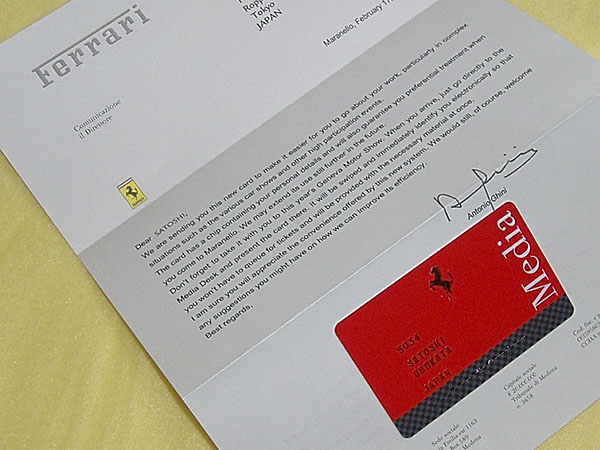 それはいいとして、フェラーリのレターによると、「マラネロでもこのカードを提示すればそれなりの待遇が保証される」と書いてあります。まあ、マラネロに行く機会があるかあるかどうかはわかりませんが、ちょっとうれしい“バースデイプレゼント”になりました(3月1日で42歳になります)。