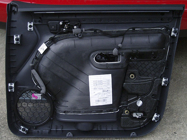 これがスピーカーが外れた様子。あとは、インナーバッフルボードをドアに固定し、そのうえにスピーカーを取り付けます。配線もお忘れなく。参考までに、赤の線がプラス、茶色がマイナスです。