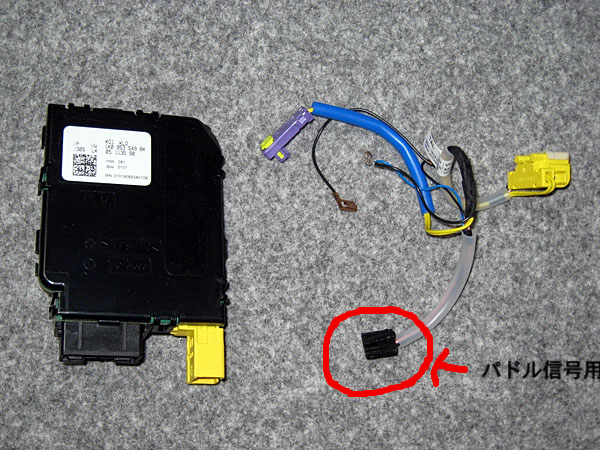 写真左がステアリングのコントロールモジュール。右がステアリングのハーネスです。ハーネスに小さい黒いコネクターがついていますが、これでパドルやマルチファンクションボタンからの信号を伝えます。トレンドラインに標準のハーネスにはこれがありません。