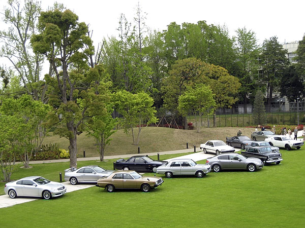 ということで、今日はスカイラインの50回目の誕生日。東京ミッドタウンに歴代モデルが勢揃いしました。